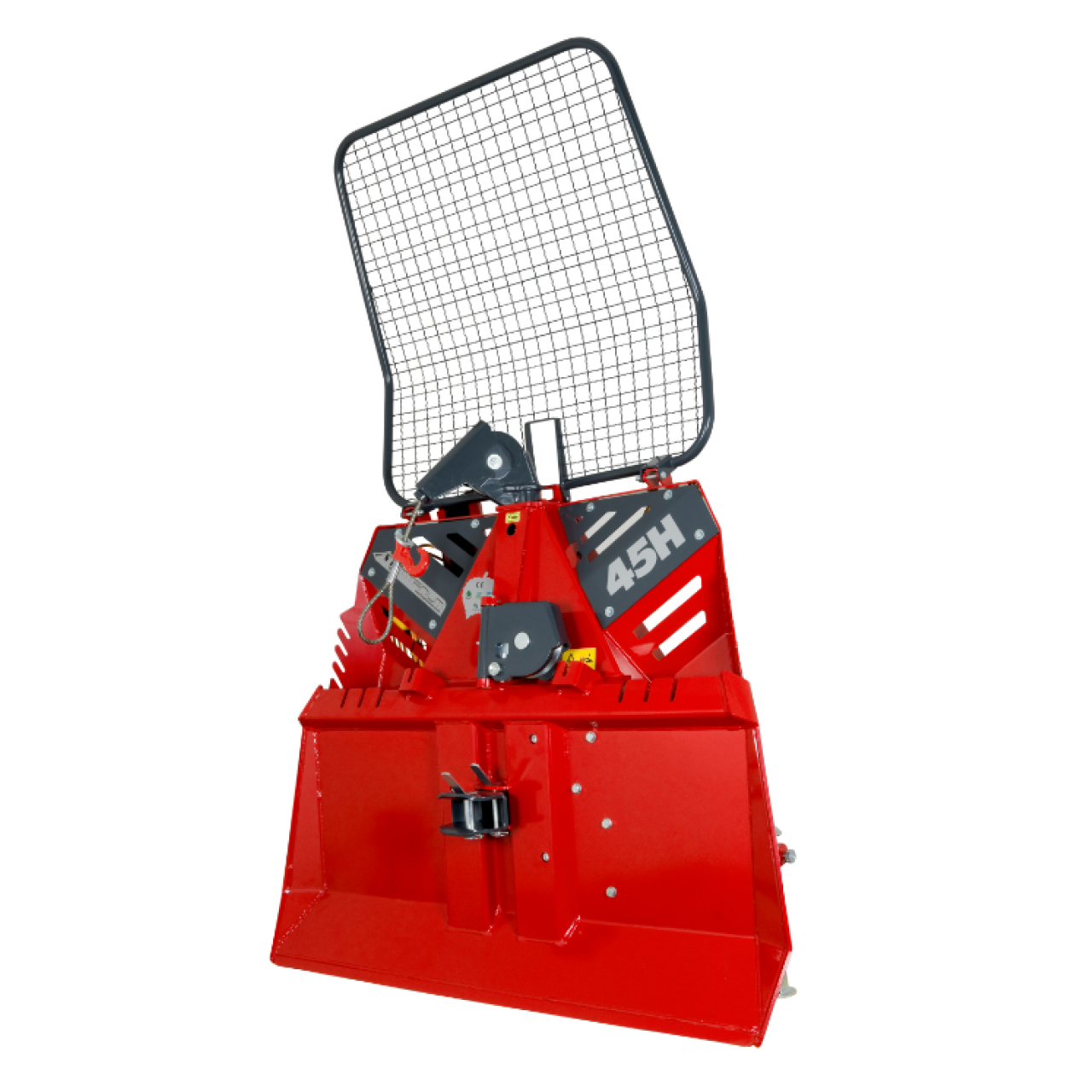Forst-Seilwinden der Titanium H-Serie für Arbeiten in schwierigem Gelände. Der Grundrahmen mit dem integrierten Rückeschild ist als Ganzstahlkonstruktion in besonders stabiler Bauweise ausgeführt. Alle dem Verschleiß ausgesetzten Antriebselemente sind thermisch bearbeitet und induktiv gehärtet. Alle Stahlteile sind antikorrosionsgeschützt. Die Forstseilwinde 45 H/HS ist für mittelgroße als auch etwas größere Schlepper geeignet. Durch das große Übersetzungsverhältnis sind niedrige Betriebskräfte erforderlich. Das Seil kann mittels einer Fernbedienung gesteuert werden. Ebenso verfügt die Seilwinde über eine automatische Sicherheits-Bandbremse und eine Seil-Laufrolle unten. Die Hydraulikelemente sind in der Säule eingebaut und gegen Schädigung und Witterung geschützt. Ebenso ist es möglich die Einstellung der Schutzgitterneigung zu ändern.
